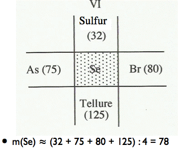 A new kind of classifications appeared at the end of the 18th century, with the development of Chemistry, namely, combinatorial classifications or cross multiple orders. This kind of classifications is either the crossing of two or more divisions, or the crossing of two or more hierarchies of divisions. In such a structure, as Granger (1967) said, “elements are distributed according to two or several dimensions, giving rise to a multiplication table”. In a combinatorial classification, the elements themselves are not necessarily distributed into classes. Only the components of these elements are classified. For Granger, this model refers to the Cartesian plane and to the ordinal principle on which it is based. The Cartesian plane, results from a will of ordering a certain distribution of points in the space, by ordering points in every row and then by ordering the rows themselves. The virtue of multiple orders is to place what is classified in the intersection of a line and a column. So, as Dagognet (1969) has shown, when an element is absent or there is an empty compartment, it can be defined by its surroundings. This is what happened in the Mendeleyev table. This table has two main advantages. First, the table is creative, so the mass of a chemical element can be calculated from those which surround it (see Figure 2), and hence, chemical elements, which did not exist in Nature but were synthesized only 30 years later in laboratories, have already been accounted for by Mendeleyev. Second, the classification is not a purely spatial picture of the world. The temporality, in particular the future, is already present in it.
