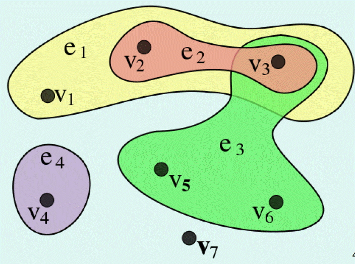 In order to clarify the situation, we start with the weakest form of them and move to stronger forms. Mathematics allows us to begin with very few axioms, that usually define weak general structures, and afterwards, by adding new conditions, one can get other properties and stronger models. In our case, the weakest structure is just a hypergraph H = (X,P) in the sense of Berge (1970), with X a set of vertices and P a set of nonempty subsets called edges (See Figure 3).