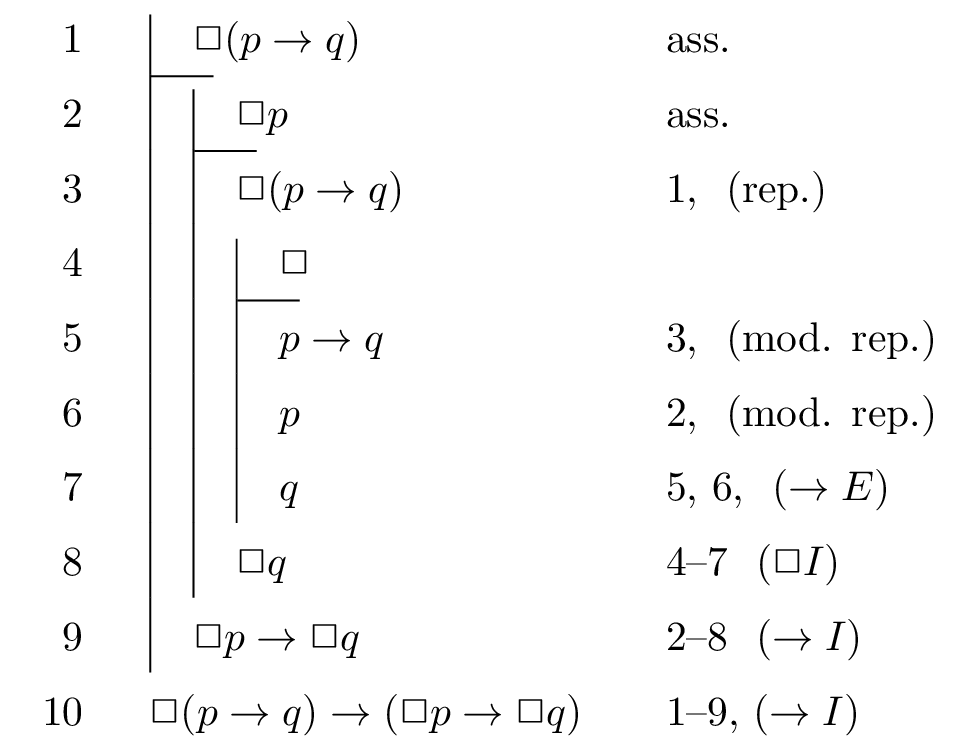 where formulas in the antecedent are also being changed by addition of \(\Box\). It is realised by means of a special ‘modal’ subproof which is opened with no assumption, but no other formulas may be put in it except those which were preceded by \(\Box\) in outer subproofs (and with \(\Box\) deleted after transition). If in such modal subproof we deduce \(\psi\), it can be closed and \(\Box\psi\) can be put into the outer subproof. The following proof in Fitch’s style illustrates this: