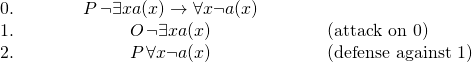 \(\begin{array}{rcl}0. & \hspace{3em} P\, \neg\exists x a(x) \rightarrow \forall x \neg a(x) \hspace{3em}&\\1. & O\, \neg\exists x a(x) & (\text{attack on }0)\\2. & P\, \forall x \neg a(x) & (\text{defense against }1)\end{array}\)