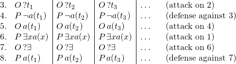 \(\begin{array}{rl|l|l|ll}3. & O\, ?t_1 & O\, ?t_2 & O\, ?t_3 & \ldots\hspace{.85em} & (\text{attack on }2)\\4. & P\, \neg a(t_1) & P\, \neg a(t_2) & P\, \neg a(t_3) & \ldots & (\text{defense against }3)\\ 5. & O\, a(t_1) & O\, a(t_2) & O\, a(t_3) & \ldots & (\text{attack on }4)\\ 6. & P\, \exists x a(x) & P\, \exists x a(x) & P\, \exists x a(x) & \ldots & (\text{attack on }1)\\ 7. & O\, ?\exists & O\, ?\exists & O\, ?\exists & \ldots & (\text{attack on }6)\\ 8. & P\, a(t_1) & P\, a(t_2) & P\, a(t_3) & \ldots & (\text{defense against }7)\end{array}\)