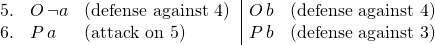 \(\begin{array}{lll|ll}5. & O\, \neg a & (\text{defense against }4)\, & O\, b & (\text{defense against }4)\\6. & P\, a & (\text{attack on }5) & P\, b & (\text{defense against }3)\end{array}\)