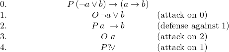 $$\begin{array}{rll}0. & P\, a \vee \neg a & \\ 1. & O\, ?\!\vee & (\text{attack on }0)\\ 2. & P\, \neg a & (\text{defense against }1)\\ 3. & O\, a & (\text{attack on }2)\end{array}$$