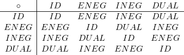 In comparison to the ordinary duality behavior of a binary operator, we thus have \(\small{n}+1\) rather than \(2\) independent negations, and generalized Post duality behavior is governed by the group \(\mathbb{Z}_2^{n+1}\) rather than \(\mathbb{Z}_2^2\) (Libert 2012). Next to \(\Tiny{ENEG}\), the operation of \(\Tiny{INEG}\) is split into \(\Tiny{INEG}_1, . . . , \Tiny{INEG}_n\), with \(\Tiny{INEG}_i\) operating on the operator’s \(\small{i}^{th}\) argument, for \(1 \ \leq \ \small{i} \ \leq \ \small{n}\). Furthermore, the isomorphism given in (\ref{eq45}) can be generalized to the one defined by (\ref{eq52}):