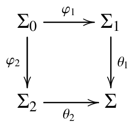 is an interpolation square when for any finite sets \(E_1\subseteq\mathrm{Sen}(\Sigma_1)\) and \(E_2\subseteq\mathrm{Sen}(\Sigma_2)\) such that $$\mathrm{Sen}(\theta_1)(E_1) \models_{\Sigma’} \mathrm{Sen}(\theta_2)(E_2)$$ there exists a finite set $$E_0 \subseteq\mathrm{Sen}(\Sigma_0)$$ such that $$E_1 \models_{\Sigma_1} \mathrm{Sen}(\varphi_1)(E_0)$$ and $$\mathrm{Sen}(\varphi_2)(E_0)\models_{\Sigma_2} E_2$$ Such commuting squares are meant to emulate the intersection-union of signatures from the common formulation of interpolation, with \(\Sigma_0\) in the role of \(\Sigma_1 \cap \Sigma_2\) and \(\Sigma’\) in the role of \(\Sigma_1 \cup \Sigma_2\). However in the common formulation of interpolation it is important that \(\Sigma_1 \cup \Sigma_2\) is the lowest signature above \(\Sigma_1\) and \(\Sigma_2\). In the generalised formulation of interpolation this property appears as a category theoretic condition, that the commuting square is a pushout in the category \(\mathrm{Sig}\) of the signatures of the institution. But when considering interpolation as a property of the institution as a whole, it is in general not meaningful to look for interpolation in all pushout squares. This leads to another generalisation layer in the formulation of interpolation, which restricts abstractly the range of \(\varphi_1\) and \(\varphi_2\) to designated subclasses of signature morphisms. Thus, given \(\mathcal{L}\) and \(\mathcal{R}\) subclasses of signature morphisms, the institution has \((\mathcal{L},\mathcal{R})\)-interpolation when each pushout of a span \((\varphi_1,\varphi_2)\) of signature morphisms with \(\varphi_1\in \mathcal{L}\) and \(\varphi_2\in \mathcal{R}\) is an interpolation square.