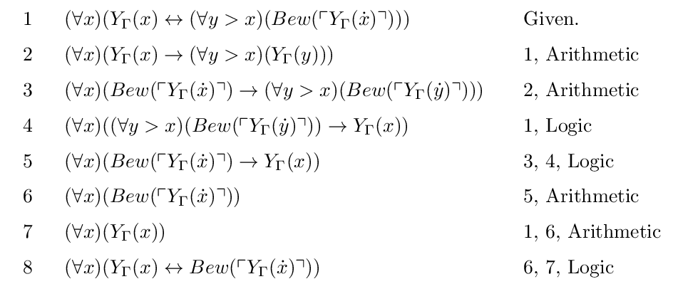 $$\begin{aligned} Y_\Gamma(1)& \leftrightarrow (\forall x > 1)(Bew( \ulcorner Y_\Gamma(\dot{x}) \urcorner))\\ Y_\Gamma(2)& \leftrightarrow (\forall x > 2)(Bew(\ulcorner Y_\Gamma(\dot{x}) \urcorner))\\ Y_\Gamma(3)& \leftrightarrow (\forall x > 3)(Bew(\ulcorner Y_\Gamma(\dot{x}) \urcorner))\\ &\vdots ~~~~~~~~ \vdots ~~~~~~~~ \vdots ~~~~~~~~ \vdots\\ Y_\Gamma(n)& \leftrightarrow (\forall x > n)(Bew(\ulcorner Y_\Gamma(\dot{x}) \urcorner))\\ &\vdots ~~~~~~~~ \vdots ~~~~~~~~ \vdots ~~~~~~~~ \vdots \end{aligned}$$